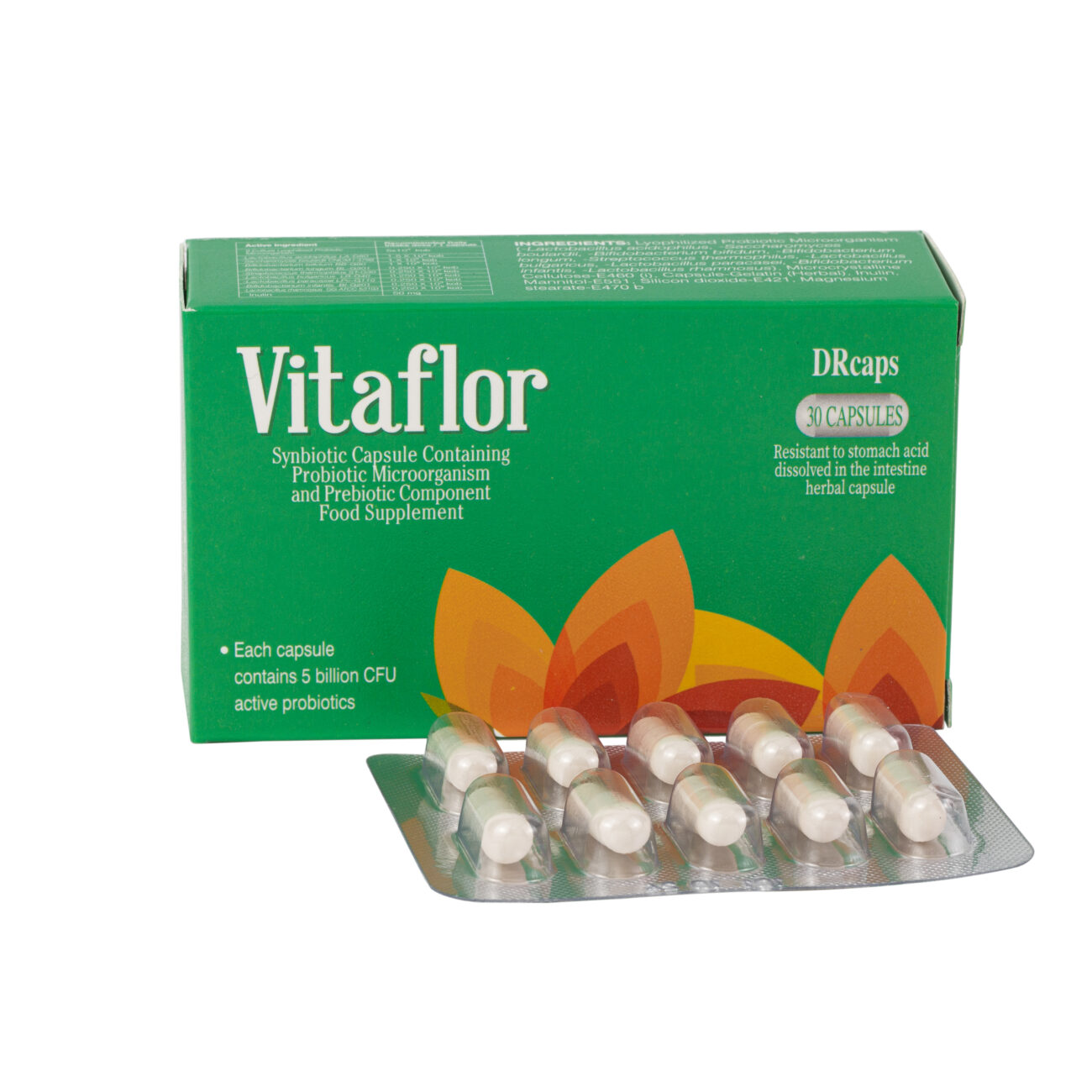 Men vi sinh Vitaflor bổ sung probiotics và prebiotics được bào chế trong viên nang giải phóng chậm (Dr caps) giúp lợi khuẩn dễ dàng vượt qua môi trường acid dạ dày, dịch mật xuống ruột và phát huy tác dụng, cân bằng hệ vi khuẩn đường ruột.